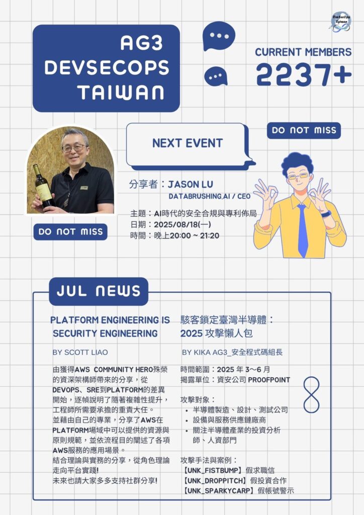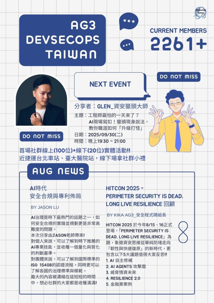 DevSecOps Taiwan DevSecOps是一種融合了軟體開發(Dev)、安全(Sec)、營運(Ops)的方法。隨著軟體開發的需求日益增加,如何使軟體開發更加敏捷(Agile)成為了一個重要的議題。DevOps提供了一種解決方案。近年來,隨著國家對於資訊安全的重視,安全(Security)也被納入了這一流程,從而形成了DevSecOps。DevSecOps不僅僅是一種技術或工具,它更是一種文化和思維方式,強調在軟體開發的每一個階段都要考慮到安全性。這種方法不僅可以提高軟體的質量,還可以確保軟體在上線後能夠安全、穩定地運行。為了推廣這種理念,AG3 DevSecOps社群應運而生,歡迎來自不同產業、職業和工作背景的朋友加入,共同交流和學習。
