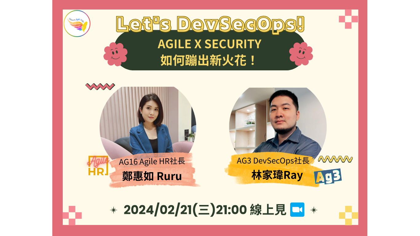 Let’s DevSecOps!Agile x Security如何蹦出新火花! 林家瑋(Ray Lin) ft. 鄭惠如(RuRu Cheng) / 20240221作者: DevSecOps Taiwan / 2024 年 2 月 21 日 Let’s DevSecOps!Agile x Security如何蹦出新火花!在這個VUCA的時代,軟體開發正面臨著前所未有的挑戰。從傳統瀑布式開發,到現在擁抱敏捷開發,我們已見證了一場深刻的變革。但在追求速度和靈活性的同時,我們要如何確保產品的安全性和可靠性呢?一場顛覆想象的技術盛會即將登場!Agile 與 Security 的碰撞,將掀起怎樣的創新浪潮?準備好迎接挑戰,與我們一起揭開神秘的面紗!