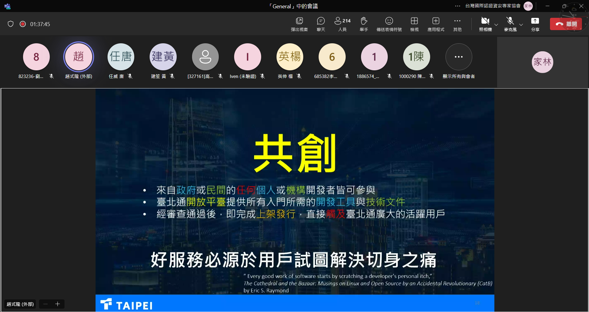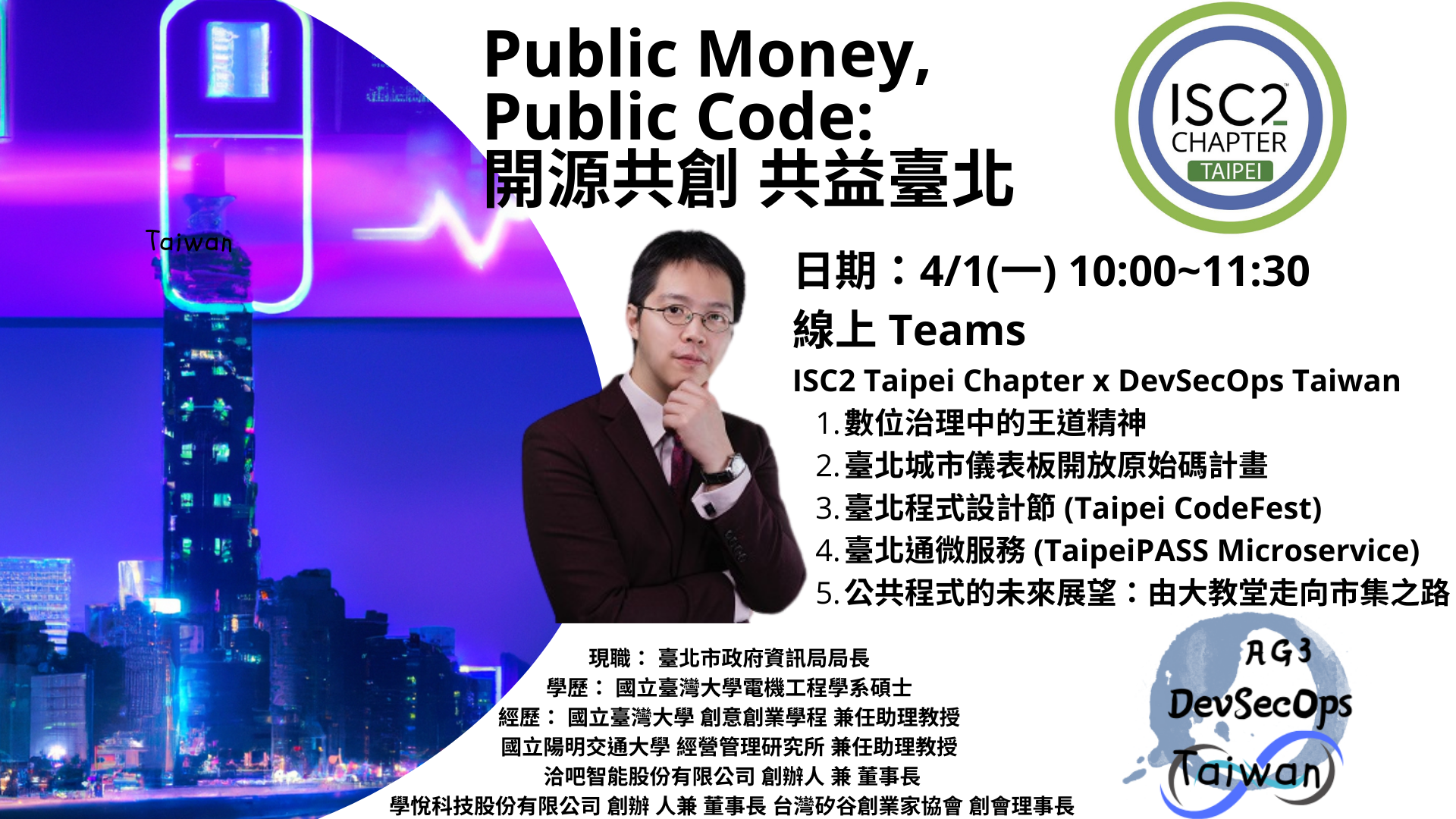 Public Money, Public Code: 開源共創 共益臺北 趙式隆局長 / 2024年04月01日作者: DevSecOps Taiwan / 2024 年 4 月 1 日 DevSecOps Taiwan x ISC2 Taipei ChapterISC2 Taipei非常難得邀請到臺北市政府資訊局局長-趙式隆局長我們社群受到ISC2 Taipei Chapter理事長邀請,可以提供DevSecOps Taiwan社群全體社員免費上線參與這一次的ISC2會員專屬線上分享(Teams不限人數)大綱:1. 數位治理中的王道精神2. 臺北城市儀表板開放原始碼計畫3. 臺北程式設計節 (Taipei CodeFest)4. 臺北通微服務 (TaipeiPASS Microservice)5. 公共程式的未來展望:由大教堂走向市集之路