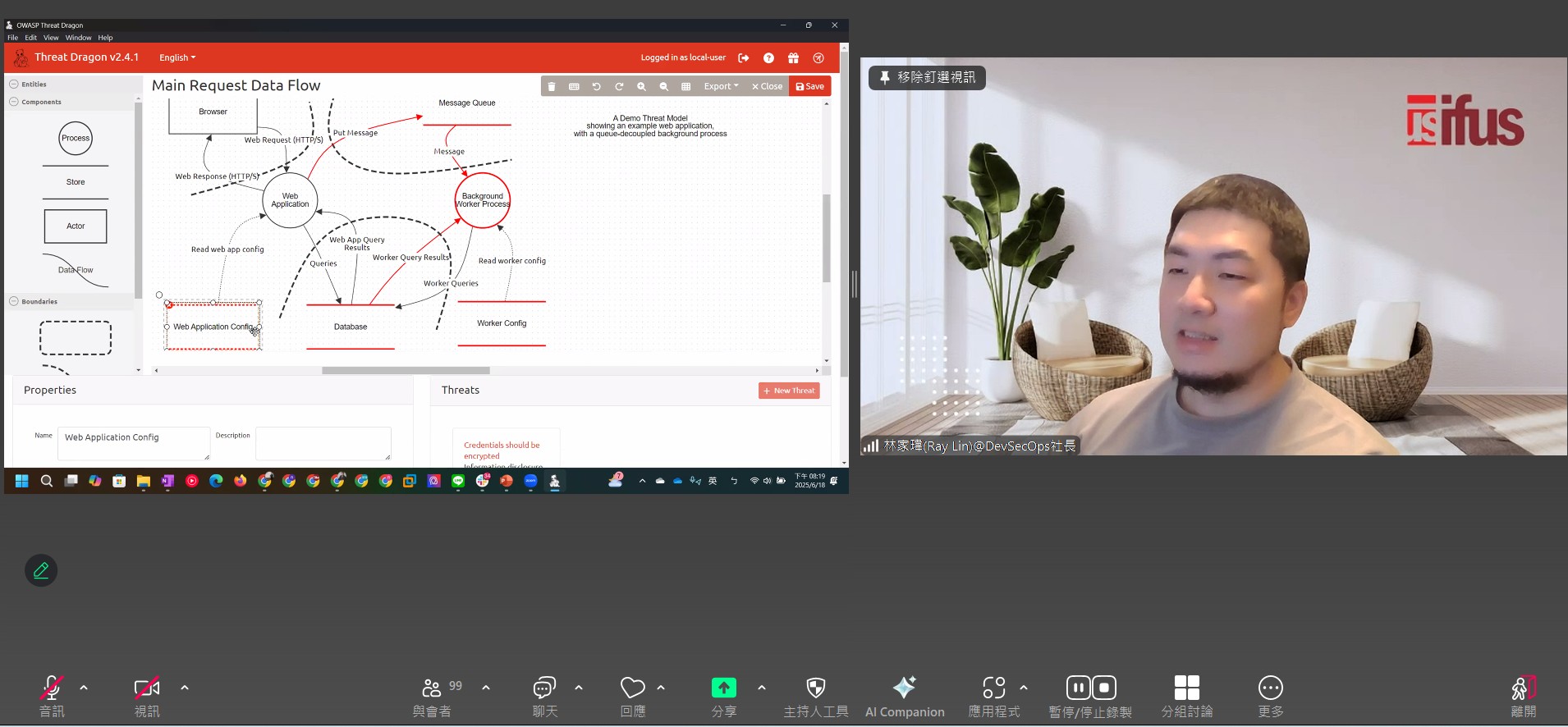 簡暴的OWASP Threat Dragon威脅建模(Threat Modeling)實作_ Ray Lin / 2025年06月18日作者: DevSecOps Taiwan / 2025 年 6 月 18 日 STRIDE是由微軟提出的威脅分類模型,幫助開發人員系統性地識別潛在威脅。通常與資料流圖(DFD)結合使用,適合於系統設計階段進行Microsoft開發的威脅建模工具,使用STRIDE與DFD建立視覺化的威脅模型OWASP開源的威脅建模工具,支援多種威脅模型與DFD,可用於建立視覺化的威脅模型可建立多種威脅模型信任邊界內的使用者或資源具有相同的存取權限或安全需求跨邊界需驗證,驗證後一定時間內不需重覆驗證元素特性(Properties)