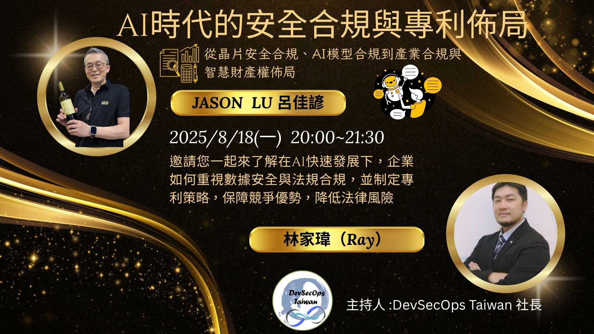 AI時代的安全合規與專利佈局_ Jason Lu / 2025年08月18日作者: DevSecOps Taiwan / 2025 年 8 月 18 日 SAFE-AI 資料重構・智慧轉型以「安全+可信任(SAFE)」為核心理念透過創新的 AI「資料重構」方法,釋放您數據資產的深層價值,為企業量身打造高隱私的 AI 「智慧轉型」解決方案。• 高隱私的資料梳理:「遵循高隱私標準收集及重構資料,在確保隱私資料保護前提下台提高數據品質,創造 AI 應用價值。」• 可信任的模型規劃:「從需求分析階段即融入可信任測試,規劃微調可靠、公平、透明且安全的 AI 模型。」• Secure Adaptive Fast Enhancement:「安全穩固、快速部署、自動適應 — 透過精準資料梳理,加速您的企業智慧化進程,提供資料價值最大化的一站式解決方案」