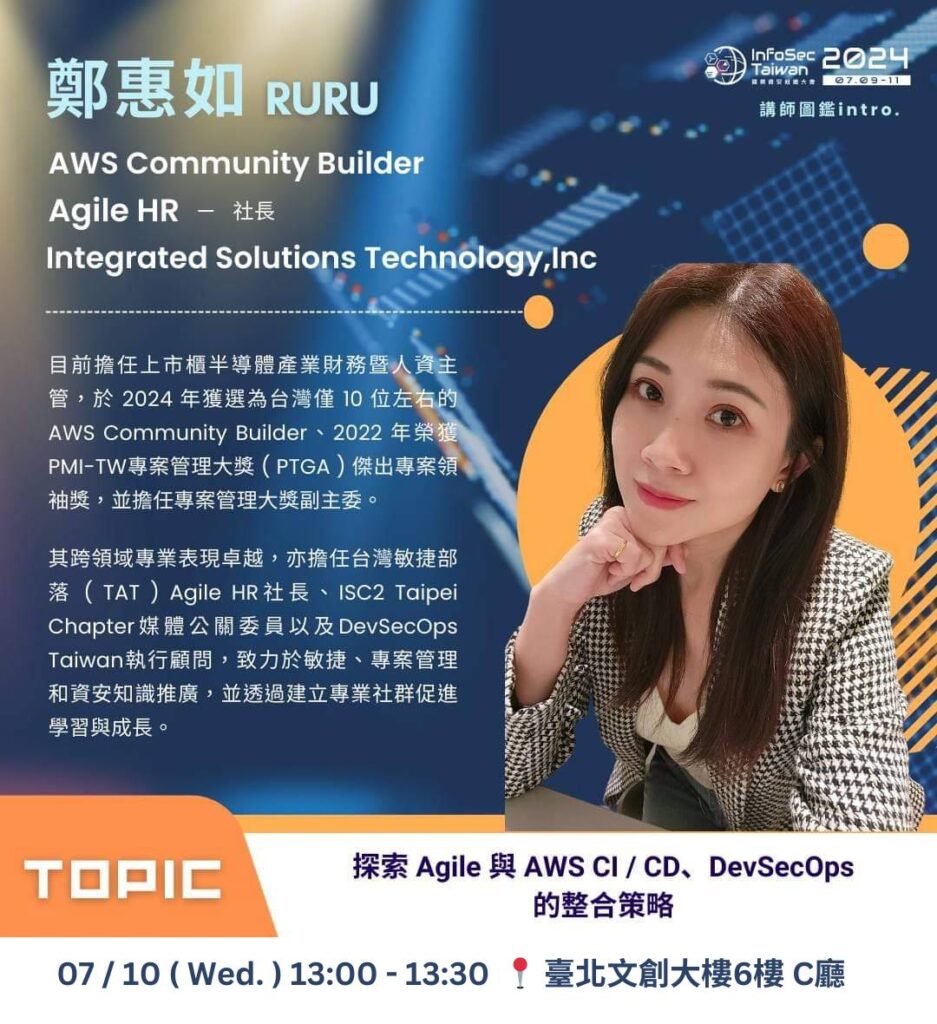 鄭惠如現任 PMI Taiwan 獎項辦公室副執行長,2024 年獲選為 AWS Security Community Builder。曾任上市櫃半導體產業人資暨財務主管、日商與新創公司產品經理,具備跨產業與國際經驗。榮獲 2022 年 PMI Taiwan Chapter 專案管理大獎(PTGA)— 傑出專案領袖獎,展現卓越的跨領域整合與專案管理實力。在 HR 領域,擅長從零開始帶領團隊重建,靈活運用線上線下混合工作模式,協助新進員工快速融入企業文化、建立認同感與投入感,並透過流程優化與團隊共識活動,強化整體組織的向心力與責任感。同時擔任台灣敏捷部落 Agile HR 社長、PMI Taiwan Chapter 常務理事、ISC2 Taipei Chapter 監事及 DevSecOps Taiwan 執行顧問,積極推動資安、雲端與專案管理的融合與應用,並協助企業與人才在變動快速的時代中發揮跨域競爭優勢。