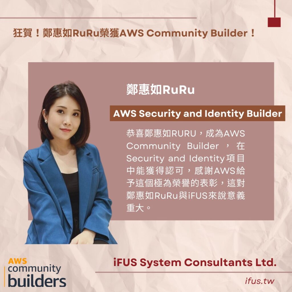 恭喜鄭惠如RuRu,成為AWS Community Builders,在Security and Identity項目中能獲得認可,感謝AWS給予這個極為榮譽的表彰,這對鄭惠如RuRu與iFUS來說意義重大。